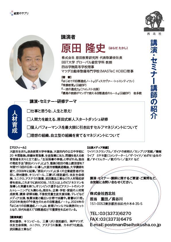 原田教育研究所を立ち上げ後からの企業研修や講演活動の実績は600社・15万人以上にのぼる。現在も教育一筋、時代の変化をとらえ、年間100本を超える登壇を行いながら、プロスポーツチームや金メダリストへのメンタルトレーニング指導、さらには 学校・家庭など、あらゆる人材育成の現場に関わり続けている。